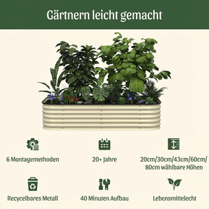 Erleben Sie eine neue Art des Gärtnerns mit unseren verzinkten Hochbeeten. Die bodenlose Konstruktion ermöglicht es den Pflanzen, ihre Wurzeln frei auszubreiten, fördert ein gesundes Wachstum und verbessert die natürliche Wasserableitung.